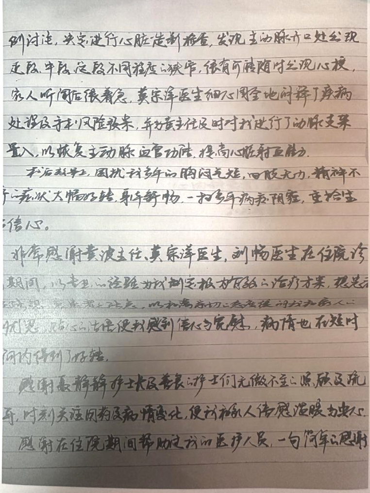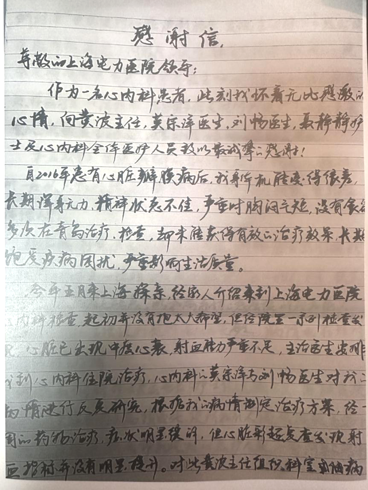 今年5月来上海探亲期间,经家人介绍来到上海电力医院心内科就诊。起初并未抱太大希望,经检查发现中度心衰,并经心脏造影检查发现主动脉开口处有不同程度的狭窄。黄波主任带领团队,认真讨论分析,对其病情进行精准评估,确定对患者实施动脉支架置入术。术后,通过先进的康复治疗技术,庄先生身体机能逐渐恢复。这封信,是对医院医疗技术不断突破的认可,也是对医护人员追求卓越医疗品质的赞誉。