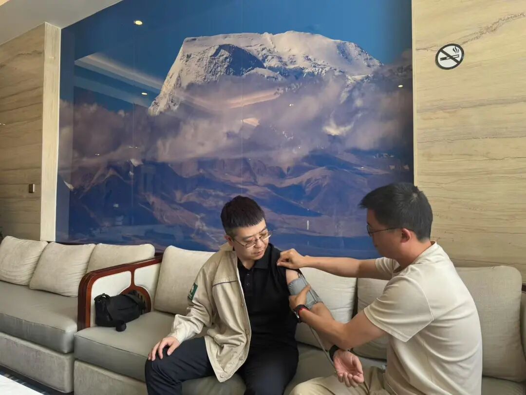 按照医院医疗保障工作安排,8月6日至20日,王昊、黄扬随国网上海电力保电队伍赴西藏,执行庆祝西藏自治区成立60周年系列活动重大保电任务医疗保障。任务期间,两人随队辗转拉萨、林芝、昌都、山南等地,坚持“作业不停,医护不撤”。针对保电评估专家成员出现不同程度的高原反应症状,实施精准监测与干预,建立个人健康档案,坚持每日早晚两次监测全员血压、血氧饱和度,做到早发现、早干预。任务期间累计完成监测280人次,同时积极进行健康宣教,引导大家科学适应高原、合理作息,通过科学宣教与动态跟踪,90%成员的高原反应在3至4天内有效缓解,实现零重症病例。此外,他们还重点关注患高血压、感冒、痛风等成员,通过与当地医疗力量协作,及时调整用药方案并加强监测,降低高原作业风险。